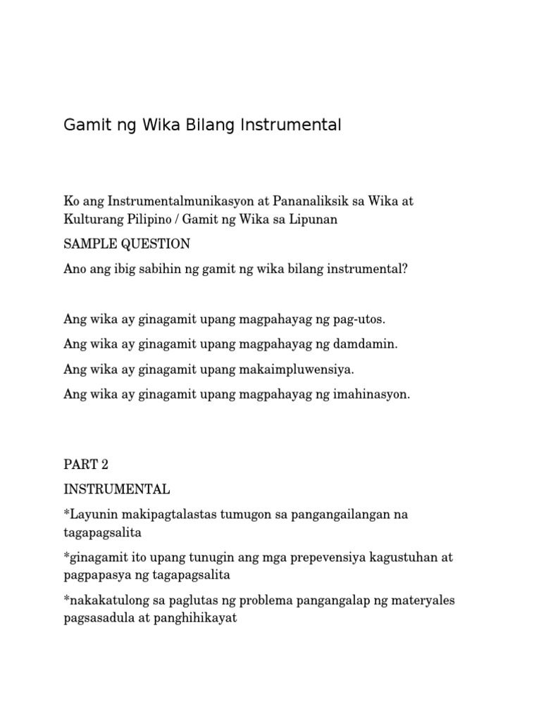 Regulatori- kumokontrol o gumagabay sa kilos at asal ng iba4. Sa aktuwal na karanasan karaniwang instrumental ang gamit ng wika para sa paglutas ng problema pangangalap ng. INSTRUMENTAL-May instrumental na tungkulin ang wika kung layunin makipagtalastasan para tumugon sa pangangailangan ng tagapagsalita.