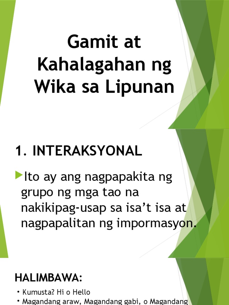 Ano ang malinaw na pagkakaiba ng instrumental at regulatori na gamit ng wika sa lipunan. Pagsisimula ng Pakikipag-ugnayan Phatic - makipag-ugnayan sa kapwa Halimbawa.