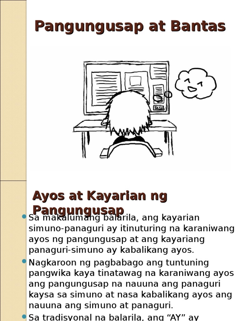 7172014 Tandaan na nauuna ang pang-uri sa simuno sa karaniwang ayos ng pangungusap tulad ng mga sumusunod. Narito ang ilang mga halimbawa ng pangungusap na nasa di-karaniwang ayos. Unahin natin ang Salok- Ilokano.