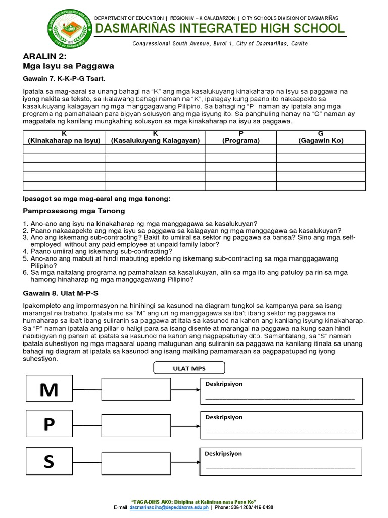Sa panghuling hanay na G naman ay magbigay ka ng iyong mungkahing solusyon sa mga kinakaharap na isyu sa paggawa. 2016-09-02 Sa makabagong henerasyon ngayon tila napakarami nang dinadaing ng ating lipunan na may kinalaman sa mga kabataan. Itala mo sa unang bahagi na K ang mga kasalukuyang kinakaharap na isyu sa paggawa na iyong nakita sa teksto sa ikalawang bahagi naman na K ilagay kung paano ito nakaapekto sa kasalukuyang kalagayan ng mga manggagawang Pilipino.