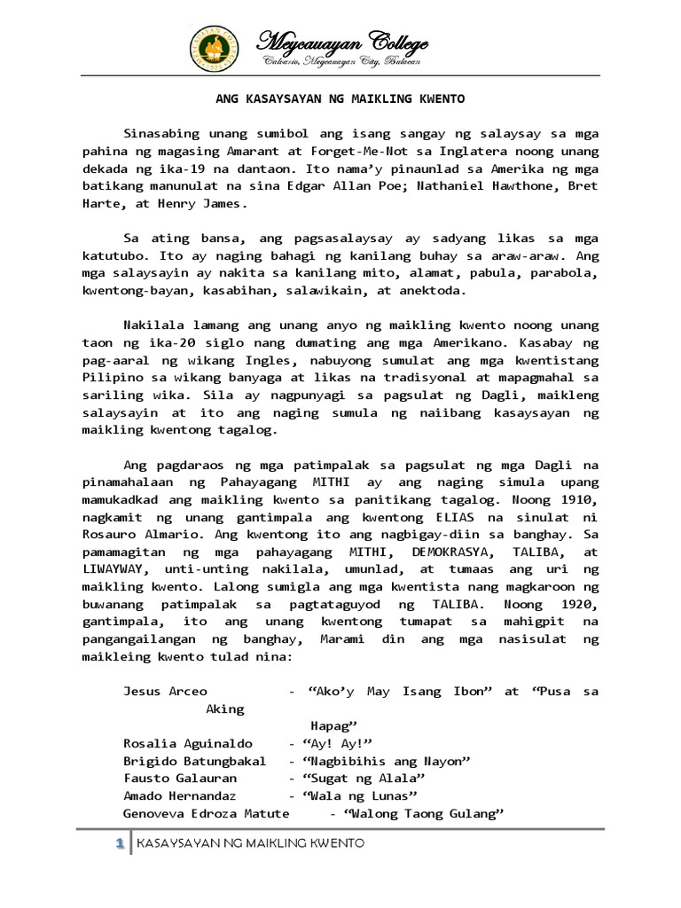 Doc Kasaysayan Ng Maikling Kwento Sa Pilipinas Jan Eed Academia Edu