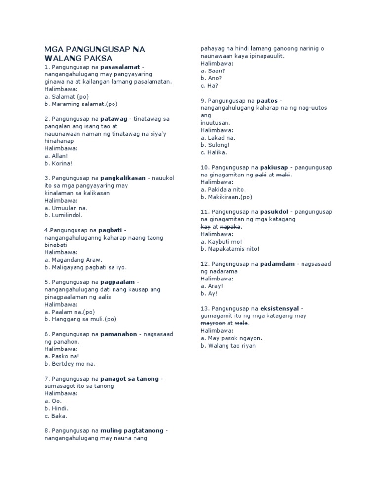 Some of the worksheets for this concept are Pinag ayaw ayaw na gawain sa filipino baitang walo taong Filipino baitang 1 ikaapat na markahan Filipino Piliin ang titik ng pinakawastong Grade 7 filipino ikatlong markahan linggo 19 Gabay ng magulang sa tagumpay ng mag aaral Exam. Start studying FILIPINO - PANGUNGUSAP NA WALANG PAKSA. Start studying Mga Pangungusap na Walang Paksa.